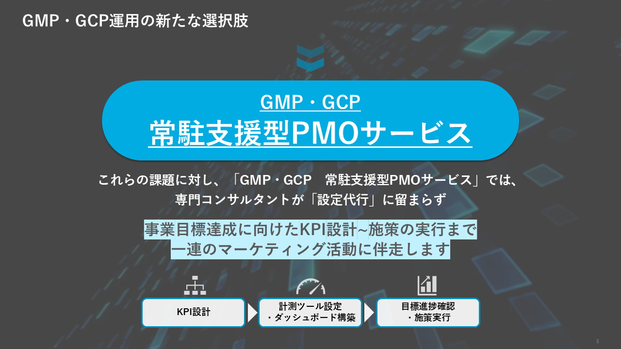 この度、当社が提供するオンサイト型(常駐型)マーケティング支援サービス『ONE-SITE』(https://onesite.hakuhodody-one.co.jp/)において、「GMP・GCP 常駐支援型PMO」サービスの提供を開始しましたのでお知らせします。