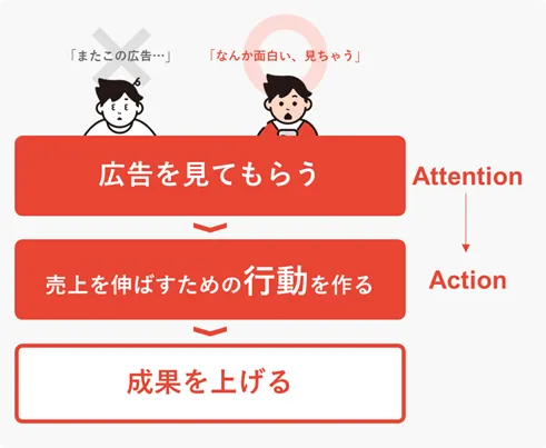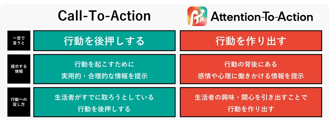 従来のダイレクトレスポンス型クリエイティブにおけるコミュニケーションの型は、オファーやスペック訴求をメインにした"Call(要請・呼びかけ)"から行動を促す「Call-to-Action(CTA)」が一般的です。Hakuhodo DY ONEが再定義した新しいコミュニケーションでは、生活者が自発的に行動を起こすきっかけとなる"Attention(興味・関心)"を与える訴求や演出をクリエイティブに取り入れます。それが「Attention-To-Action」の考え方です。