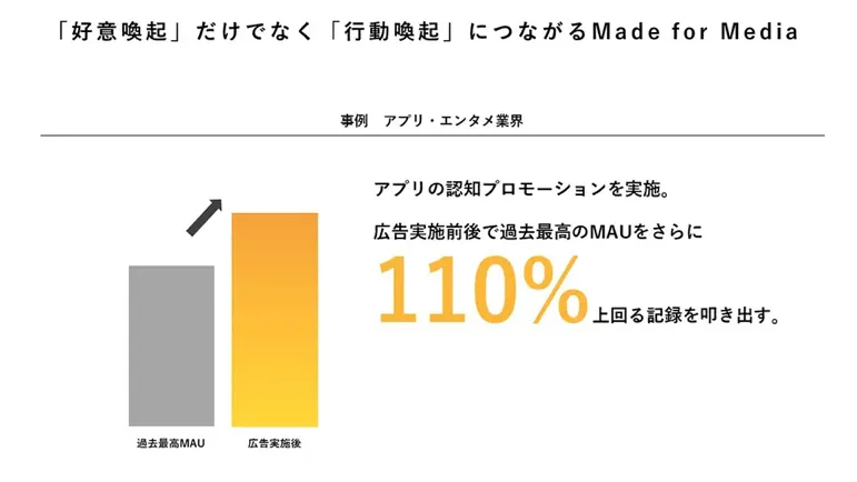 「好意喚起=ブランド好意度や想起の指標」と「行動喚起=クリックやCVの指標」の両方で施策を評価することで、メディアを横断した最適なプランニングを提供します。当社が実施したアプリの認知プロモーション案件では過去最高のMAUを記録した事例もあり、好意喚起に留まらず、行動喚起の獲得成果にも貢献することができます。