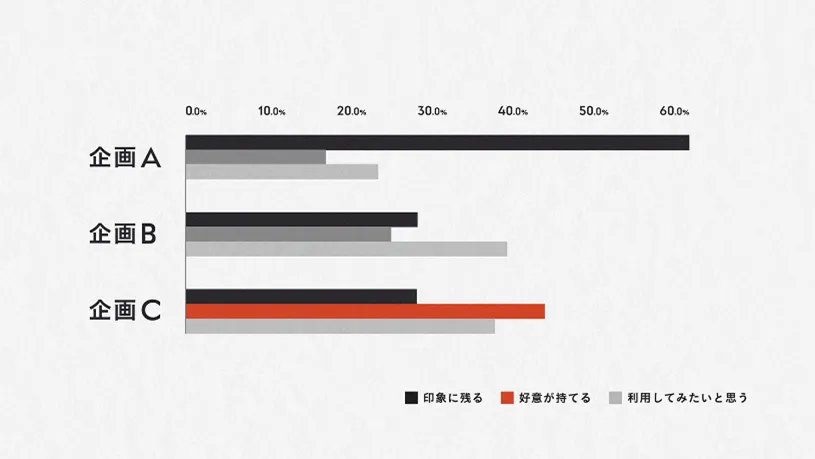 好意度や利用意向度など目的に応じた指標を用いて企画に対する反応を事前に検証します。そうすることで、プランナーの感覚に左右されすぎずにより客観的な視点で効果が見込める企画を実施することができます。