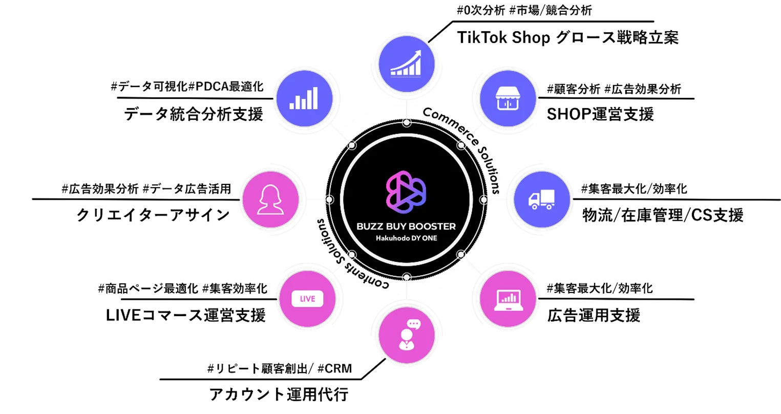 「BUZZ BUY BOOSTER ™」とは、TikTokプラットフォーム上で利用可能なEC機能「TikTok Shop」活用のために、戦略策定から運営までワンストップで支援するサービスです。Hakuhodo DY ONEをはじめ、博報堂DYグループのデジタルメディアおよびeコマース領域におけるスペシャリストが連携し、クライアント企業のビジネス成⻑の伴⾛パートナーとして、市場への早期参⼊を全⾯的に⽀援します。