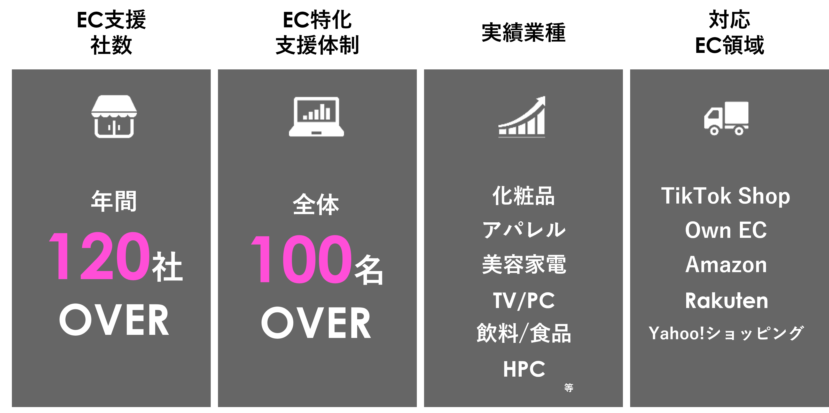 Hakuhodo DY ONEは業種を問わずEC支援の実績が豊富です。自社ECや日本の主流ECモールを横断した統合的なデータ分析に基づき戦略を策定し、クライアント企業の全体売上最大化を目指します。
