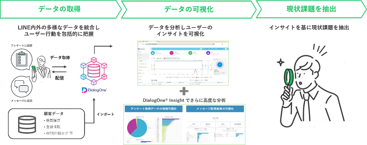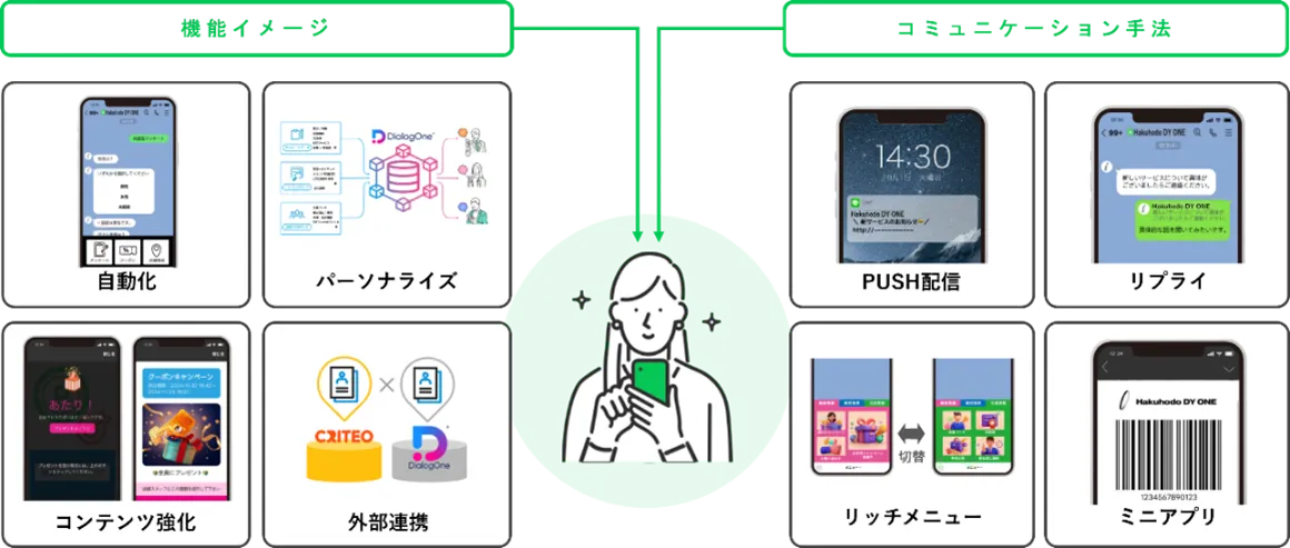DialogOne®は、Hakuhodo DY ONEが自社開発した、LINE公式アカウントの成果を最大化するマーケティングソリューションです。LINE内外の多様なデータを統合し、個々のユーザーに最適化された施策を実現します。豊富な機能とHakuhodo DY ONEが培ってきたコミュニケーションノウハウを組み合わせることで、ストレスフリーな顧客体験を提供し、企業と顧客双方の負担を軽減します。顧客との深いエンゲージメント構築を通じて、企業の持続的な成長に貢献します。