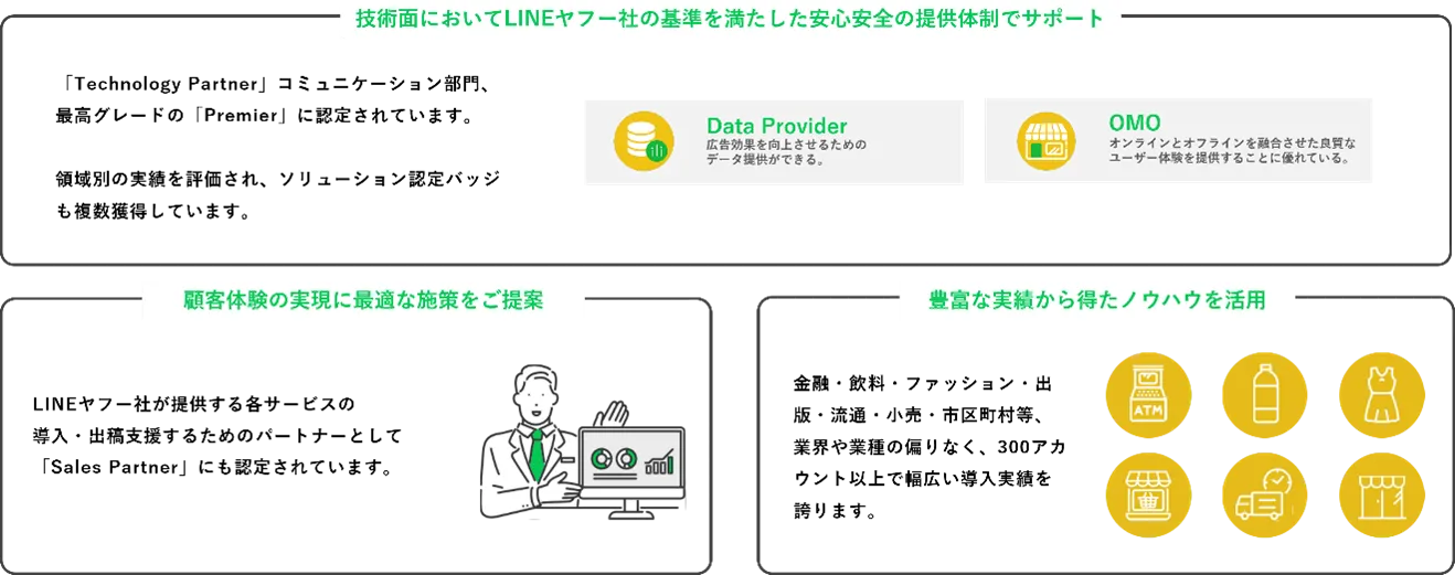 Hakuhodo DY ONEは、LINEプラットフォームを活用し、多様な業種のマーケティングを支援した300アカウント以上の豊富な実績を有しています。LINEヤフー社のパートナーとして認定された外部からの高い評価と、実践で培った確かなノウハウで、クライアント企業がストレスなく成果を上げられるよう支援します。