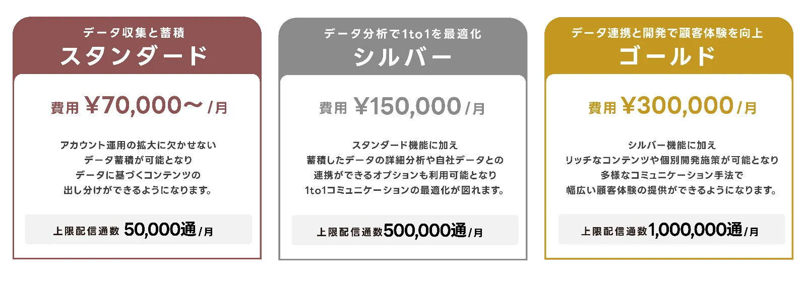 「一斉配信に留まるコミュニケーション」「顧客データ連携の不足」「LINE公式アカウント機能の活用不足」といった課題に対し、ビジネスの規模や目的に合わせて、最適なプランを提案します。基本機能とサポートを備えているので、初めての方から本格運用まで柔軟に対応します。