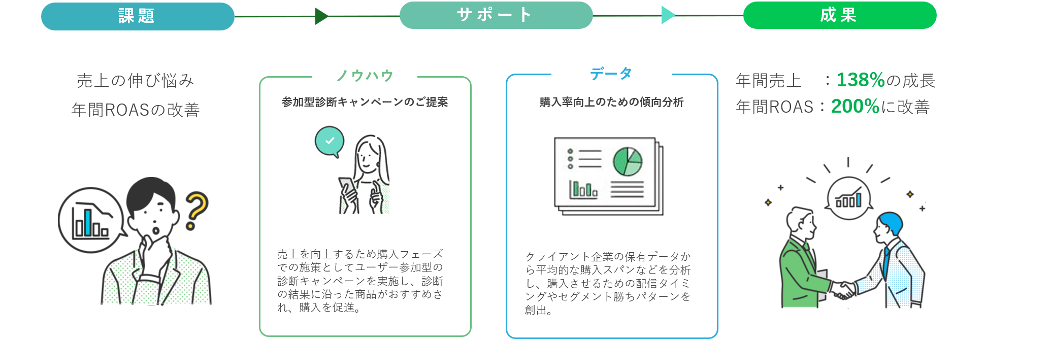 売上向上のため、購入フェーズの施策として「参加促進型キャンペーン」を実施。また、クライアント企業が保有するデータを活用し、購入率向上のための傾向分析をおこない、ユーザーの行動傾向を深く洞察。結果、年間売上は138%成長、年間ROASは200%へと改善を実現しました。