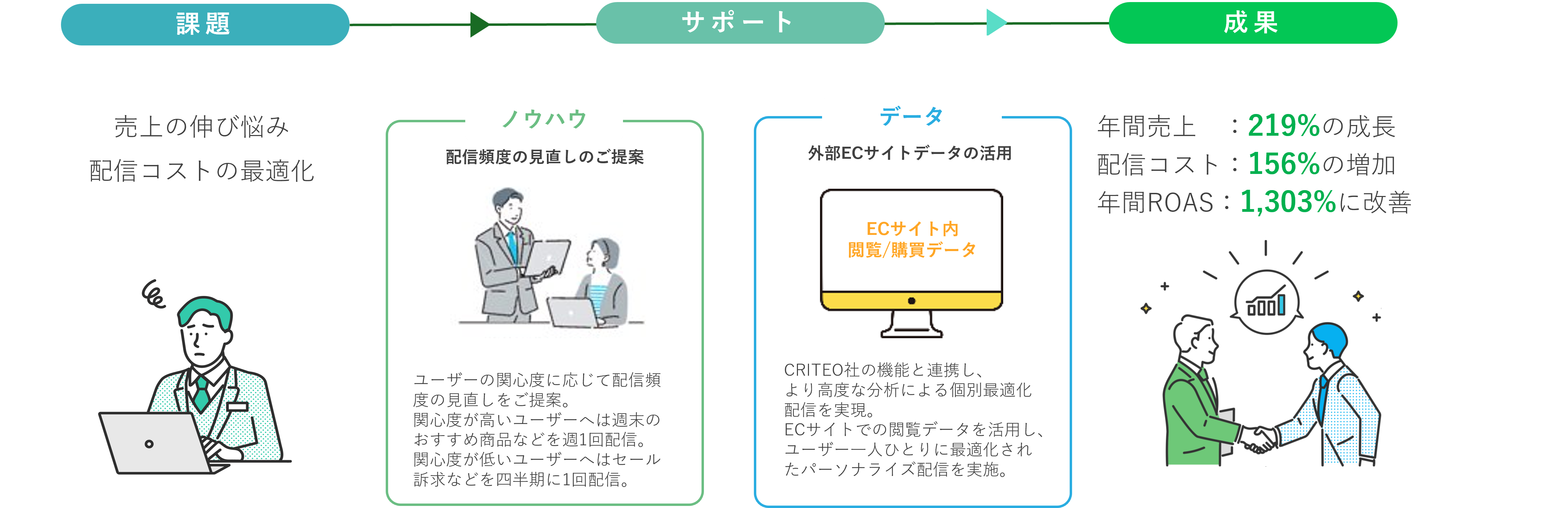 ユーザーのサイト閲覧頻度や商品への興味度合いを詳細に分析。データに基づき、ユーザーの閲覧頻度に合わせて配信頻度を見直し、商品やキャンペーン情報をユーザーごとに適切なタイミングで配信しました。さらに、外部ECサイト内の閲覧・購入データを活用し、ユーザー一人ひとりに最適化されたパーソナライズな配信を実施。結果、年間売上は219%成長し、配信コストは156%増加し、年間ROASは1,303%に改善しました。