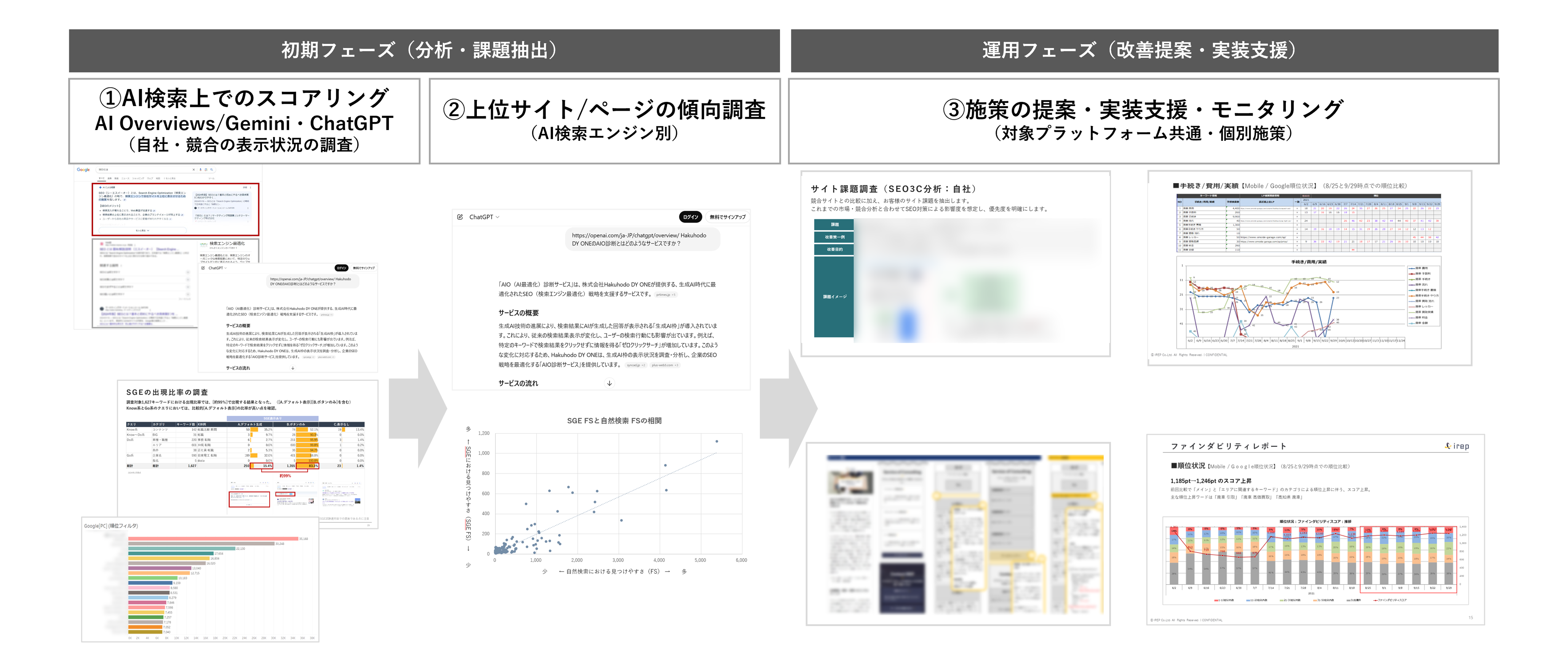 これらの施策を総合的に実行することで、AIOとSEOの両面からAI時代に適応したWebサイトの競争力を高め、クライアント企業のビジネス成果を支援します。実装支援が必要な場合には、博報堂DYグループの博報堂アイ・スタジオと連携し、確実なWebサイト実装をおこないます。さらに、実装後はAI検索における表示状況や順位の推移を継続的にモニタリングし、レポートと改善提案を提供することで、持続的な成果創出をサポートします。