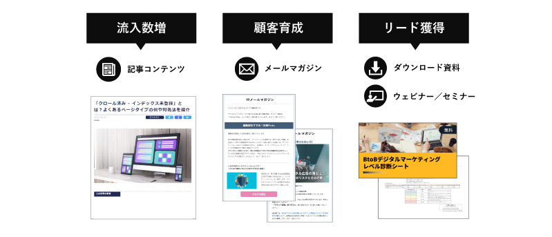 ユーザーが自ら情報を収集し、課題を形成・解決するプロセスにおいて、企業が価値あるコンテンツを提供することで、ユーザーの自然な購買行動への促進を図ります。具体的には、ブログ記事やメールマガジン、ダウンロード資料など、多様なコンテンツ形式を活用し、ターゲット層に有益な情報を発信します。