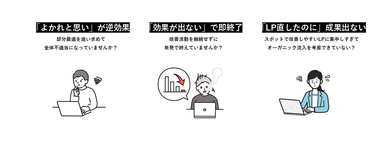 スポットで改善しやすいLPに集中しすぎてオーガニック流入を考慮できていますか?ユーザーが求める体験を意識しない自己流の改善では、Webサイトの真価を引き出せない。広告流入とオーガニック流入両方の視点で改善することが重要です。