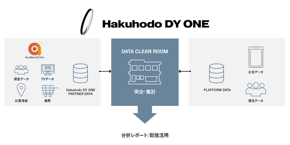 Hakuhodo DY ONEではデータクリーンルーム等の環境を活用し、博報堂DYグループ独自の生活者データをはじめ、各種外部パートナーデータを安全かつ効率的に統合・分析する基盤を構築しています。この基盤を活用し、最適な広告効果の分析や配信をおこないます。