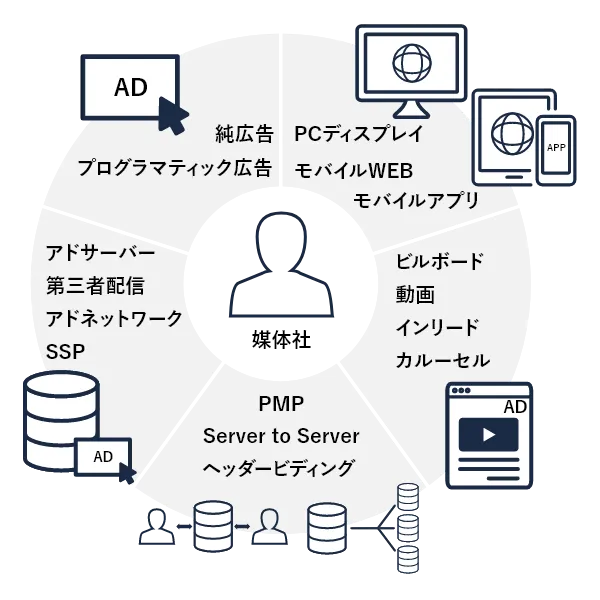 広告配信システム、配信オペレーション、専門的なサポート体制をワンストップで提供。媒体社の広告運用に関わるあらゆる側面を包括的に支援します。
