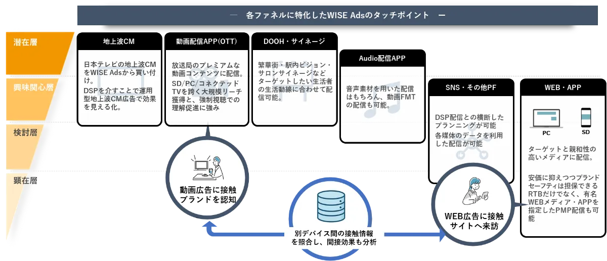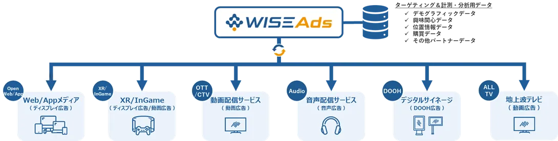 WISE Adsは、多様なデジタルメディアへの広告配信が可能なDSPを主軸とした媒体を横断するプランニングとともに、Cookieに依存しないデータを利用した広告配信サービスを組み合わせることで、クライアント企業にとって最適なデジタル広告配信を実現します。
