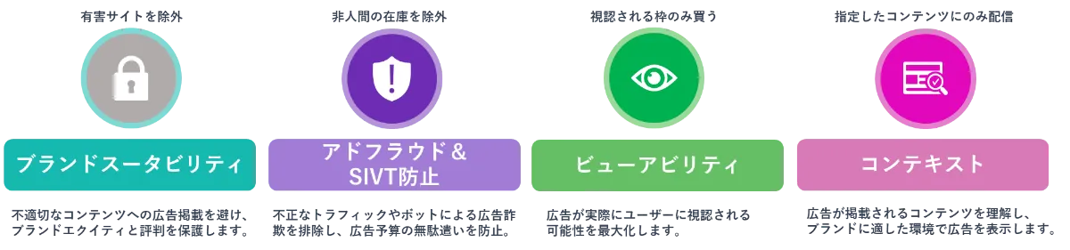 国内DSPで唯一DoubleVerify社と提携し、世界基準のブランドセーフティ機能を標準で搭載しています。有害サイトへの広告掲載の除外、アドフラウド(不正な広告表示)やSIVT(無効なトラフィック)の防止、ビューアビリティ(広告が実際にユーザーに見られた割合)確保、コンテキストターゲティング(コンテンツ内容に合わせた広告配信)により、広告掲載面の品質と安全性・透明性を保証し、キャンペーンの効果を最大化します。