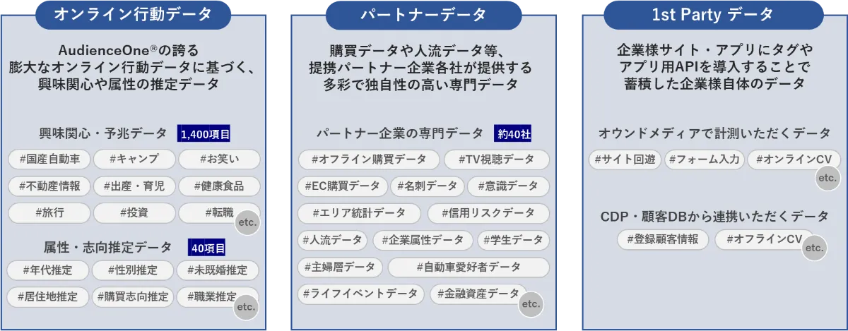 当社が提供する国内最大級のDMP「AudienceOne®」に接続。2兆を超える膨大なオンライン行動データを活用し、豊富なデモグラフィックデータや興味関心データ、1,400種類以上の嗜好性データに基づいた、精度の高いターゲティングが可能です。