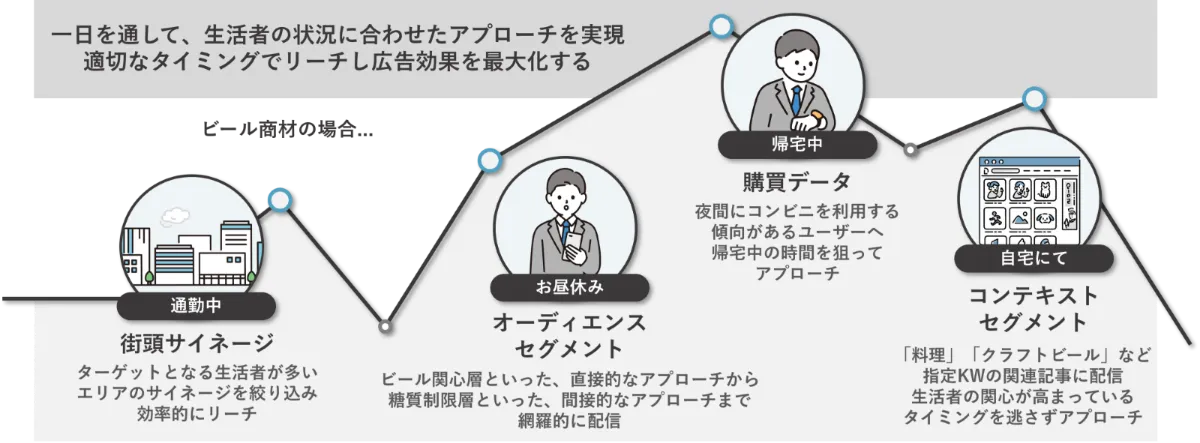 地上波テレビを含むあらゆるメディアタッチポイントをデジタルで統合することにより、ユーザーの行動データに基づき、最も効果的なタイミングと場所で広告を配信します。生活者のメディア接触行動全体を捉え、一貫性のある広告体験を提供します。