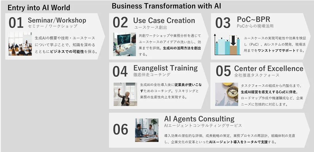 最新の生成AI技術を活用し、企業における組織・業務の変革や顧客体験を高めることで、生産性向上を支援するコンサルティングサービスです。